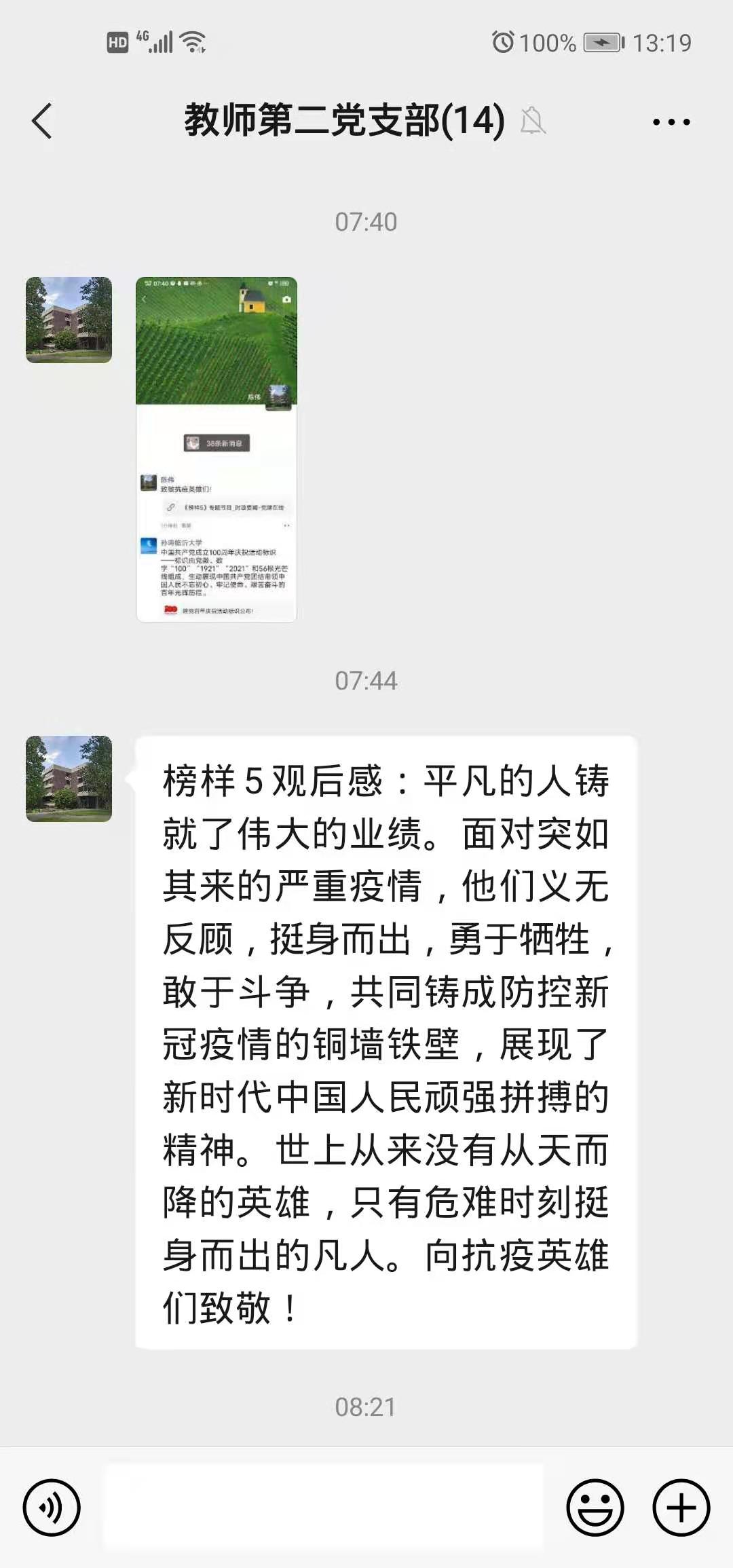 通过这次学习观看《榜样5》节目,党员教师纷纷表示,在庆祝建党100周年和开展党史学习教育之际,要深入学习投身疫情防控工作的共产党员的大无畏气概和伟大的抗疫精神,充分发挥党员干部模范带头作用,立足岗位做好本职工作,用忠诚担当诠释初心责任,切实担负起立德树人的光荣使命。