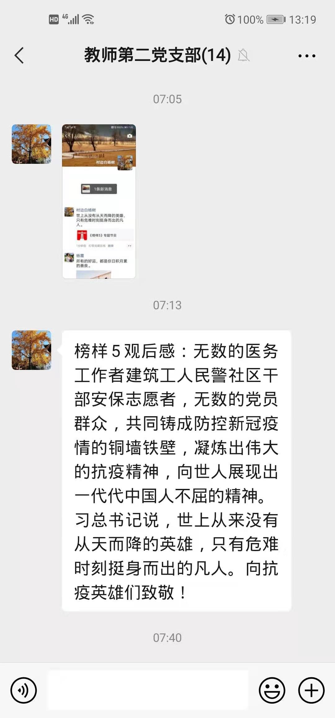 按照学校组织部有关通知要求,3月23日,437ccm必赢国际app第二教师党支部组织全体党员学习观看央视《榜样5》专题节目,并展开研讨交流;让党员教师体悟榜样精神、汲取奋进力量。