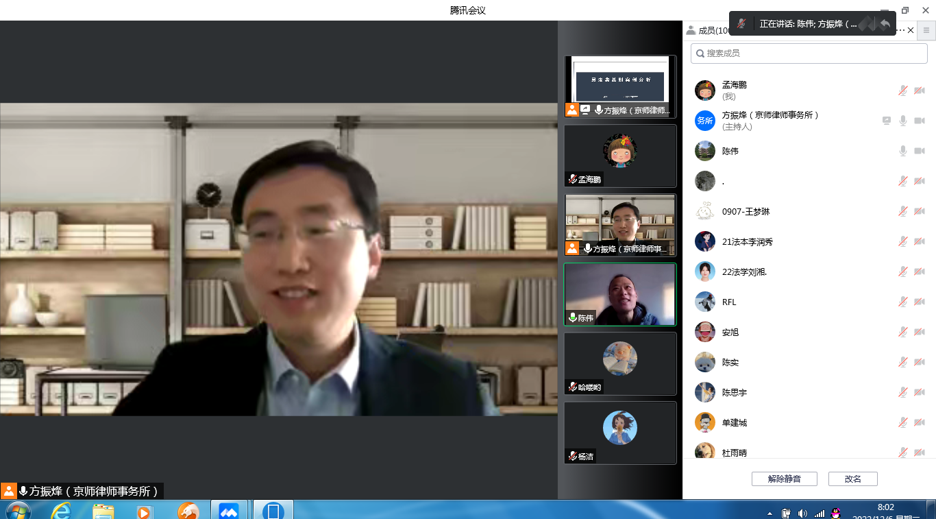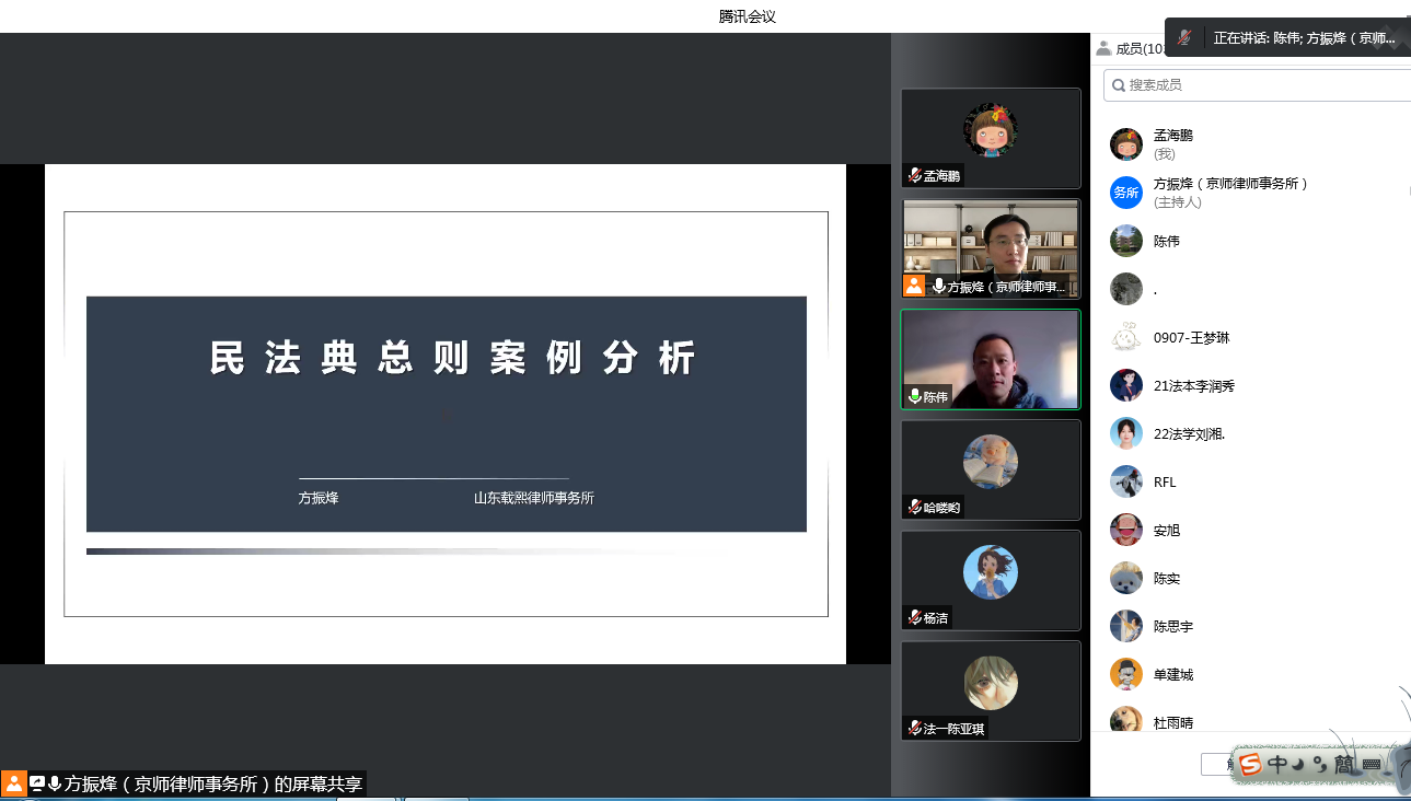 2022年12月6日,山东载熙律师事务所方振烽律师通过腾讯会议为437ccm必赢国际app2022级法学本科学生授课。方律师结合实务工作中所办理的案例,讲解了《民法典》总则部分的民事主体、民事法律行为、代理、诉讼时效、法律文书写作等内容。授课通过对具体案例的细节分析,贯穿涵盖了民法总论的多个重要知识点,内容生动丰富,受到同学们的好评。