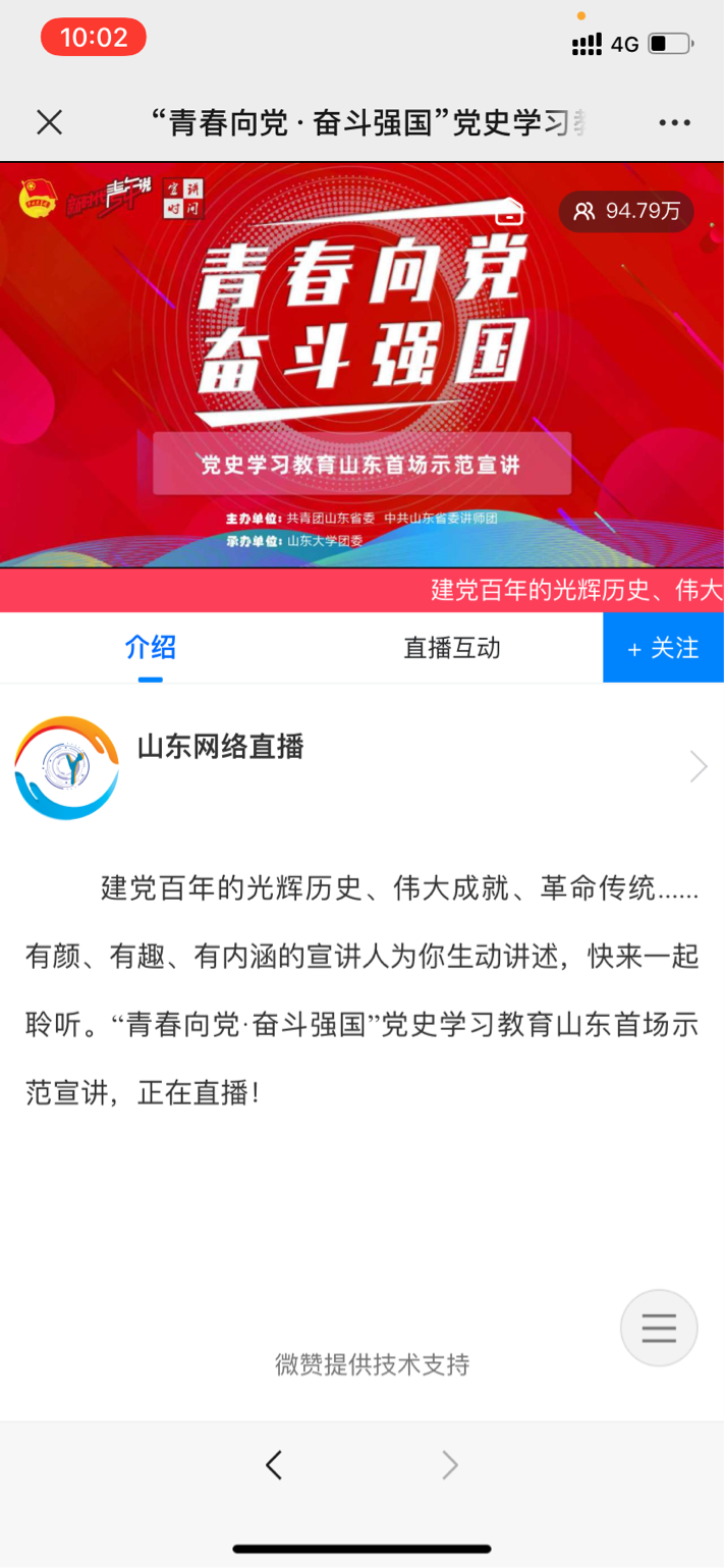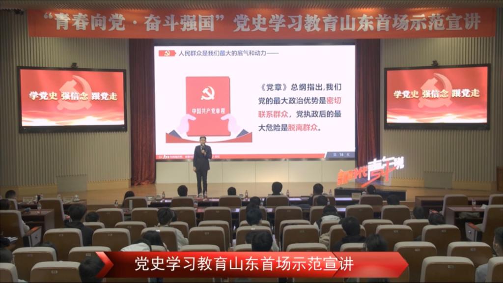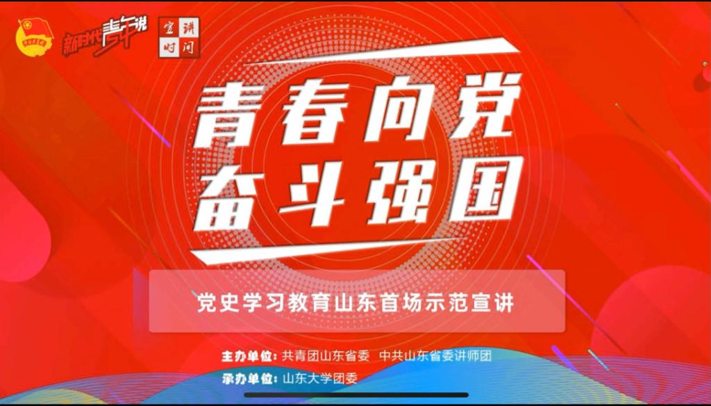 2021年4月16上午9:30-11:30,于山东网络直播平台,437ccm必赢国际app有序组织学生收看了山东省首场“青春向党,奋斗强国”示范宣讲直播活动。此次活动旨在让同学们更加认识党,了解党,坚持学史明理、学史增信、学史崇德、学史力行,深刻领会习近平总书记的重要讲话的丰富内涵,扎实党史学习教育。