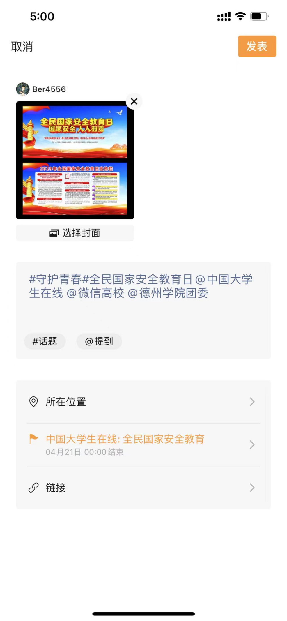 该活动由中国大学生在线、腾讯发起“守护青春、感悟新时代国家安全成就”全民国家安全教育日线上视频号话题,学生们通过关注微信视频号“@中国大学生在线”后进入首页“全民国家安全教育”活动专题,添加话题#守护青春 #全民国家安全教育日,并@中国大学生在线 @微信高校 @437ccm必赢国际app官方账号后发布原创主题短视频,参与话题接力。