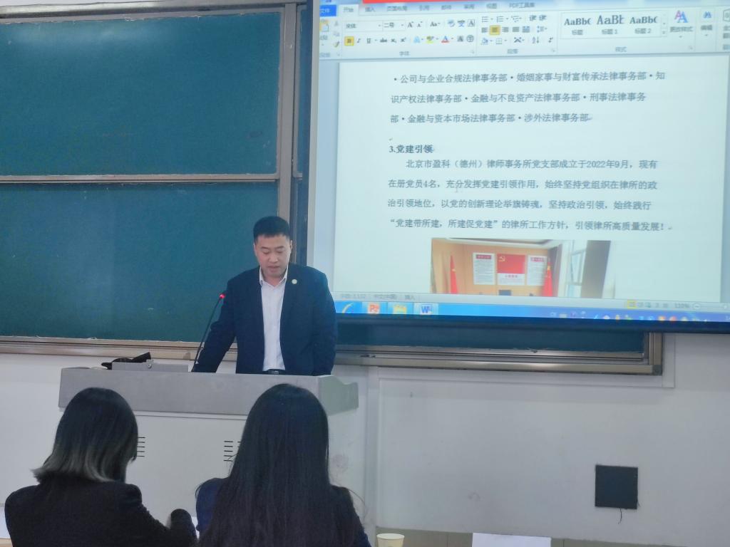 4月26日下午,盈科(德州)律师事务所党支部书记付辉、执行副主任李方超等一行人来必赢官网开展座谈交流会。学院组织学生在博文楼427参加该座谈交流会。