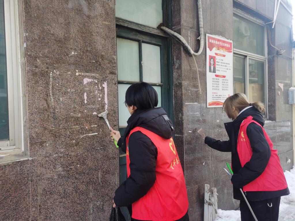 活动伊始,社区街道的工作人员为志愿服务队的同学们介绍了社区情况并分发了劳卫工具。志愿者在社区街道工作人员的带领下,维护社区卫生,清除主干道及居民楼周边的积雪,清理卫生死角及小广告,同时对毒饵站点进行了仔细查看。