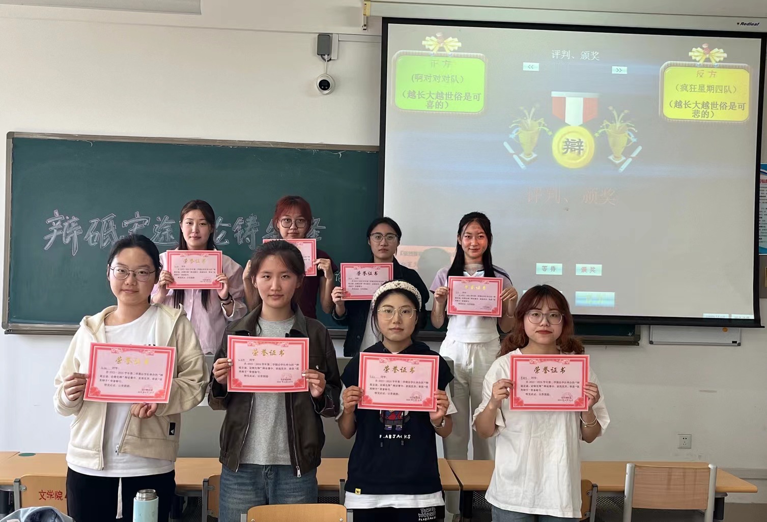 活动伊始,由辩论赛主席对辩论流程进行了介绍,正反方辩手做充分的赛事准备。随后,正反方辩手依次轮流发言,就“人生之美在于瞬间还是永恒”“年轻人应不应该按社会期待而活”“越长大越世俗是可喜的还是可悲的”辩题展开辩论,在开篇立论、总结陈词两个部分中各方辩手对自己方的观点进行了出色的阐释,在自由辩论环节辩论氛围精彩激烈。最后,观众们给予辩手们最热烈的掌声鼓励,活动负责人给辩手颁发“优秀辩手”证书并合影留念,本次“辩砥宏途,论铸先锋”主题活动圆满结束。