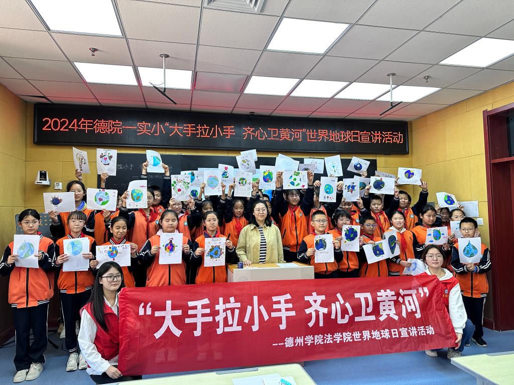 活动伊始,主讲老师以“你眼中的地球是什么样的?”“你喜欢地球上的什么?”“不喜欢地球上的什么?”等问题,带领同学们思考自己眼中的地球,并鼓励同学们发散思维,画出自己心目中的地球。通过彼此间的分享交流,许多生动有趣的“地球”跃然纸上。然后,主讲老师以视频观看、问答互动的方式,为小朋友们介绍了世界地球日的内涵、环境保护的措施等,使同学们对地球生态有了新的认识。接下来,437ccm必赢国际app志愿者以幽默诙谐的方式向同学们介绍了《环境保护法》和《黄河保护法》的相关内容,让同学们既明白了法制的现实意义,也明确了自身的责任和担当。最后,437ccm必赢国际app志愿者向同学们介绍了德州得天独厚的地理位置并宣传黄河运河法治保护思想,以学唱歌曲《保卫黄河》、背诵关于黄河的古诗作为收尾,更加激发了同学们对于家乡的热爱,坚定了同学们保护生态环境的决心。