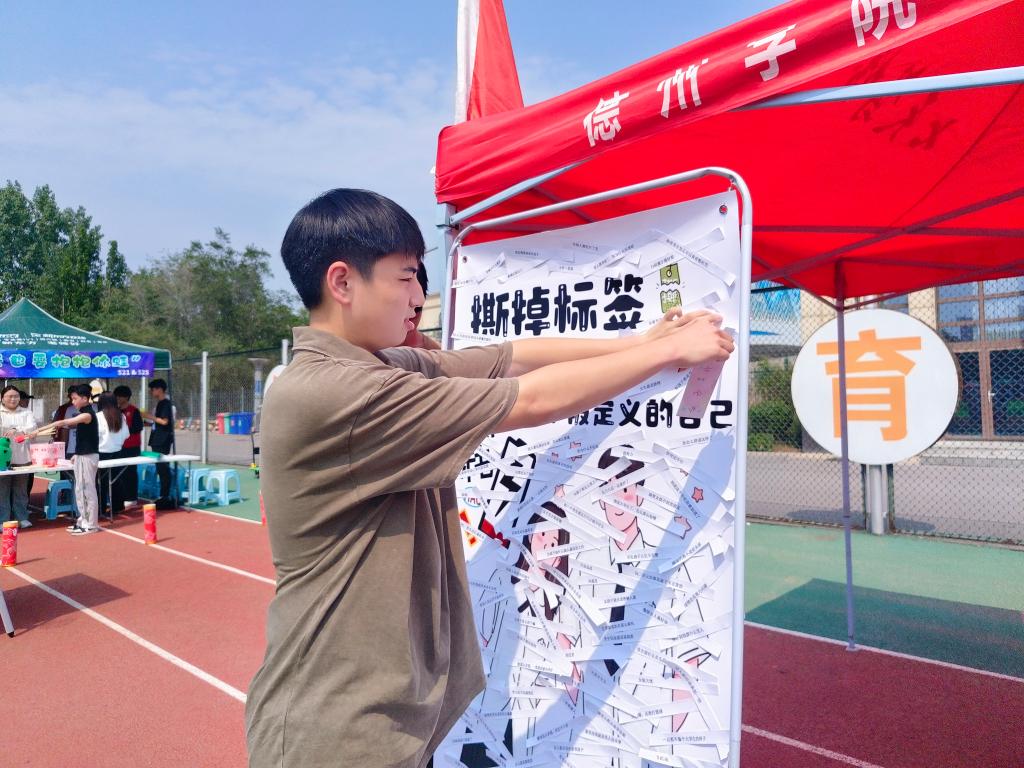 心理游园会共有两个环节,其中第一个环节——“记忆大师”活动,同学们随机抽取心理健康知识资料卡,进行两分钟快速记忆,然后用自己的语言还原内容,该环节不仅锻炼了同学们的记忆力和语言表达能力,还增强了竞争意识,活动现场气氛热烈而紧张,吸引了众多同学参与。第二个环节——“拒绝标签,破茧成蝶”当代大学生自我认知与成长活动。活动现场设有贴满标签的人形立牌互动区,同学们纷纷走到人形立牌前,撕掉自己不喜欢的标签,如“玻璃心”、“外貌协会”、“公主病”等标签,表达了自己拒绝被定义、追求真实自我的决心,并在寄语墙上留言,写下自己感悟,分享了对自我成长的期许与展望。