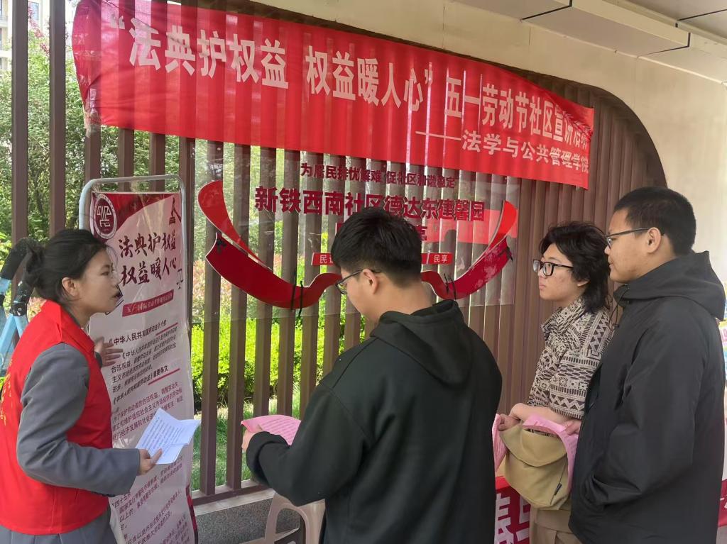 在第145个“五一”国际劳动节来临之际,为践行“法治为民”理念,2025年4月26日,法学与公共管理学院志愿者走进新铁西南社区,开展“法典护权益,权益暖人心”主题公益普法活动。活动通过多样化的形式,为社区居民送上法律“及时雨”,全力护航劳动者依法捍卫自己的权益,守护他们的合法权益。