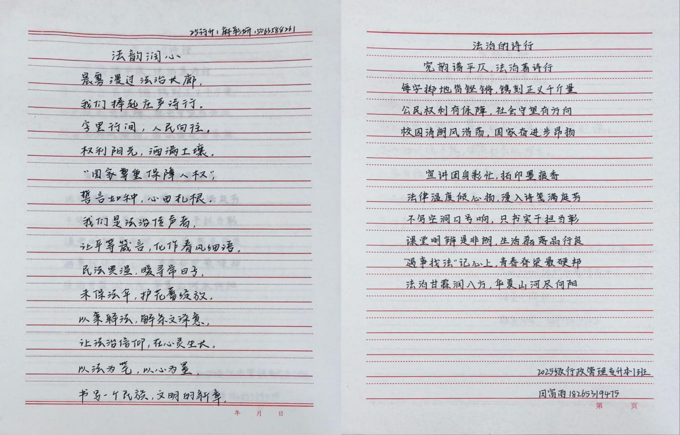 为深入贯彻落实全面依法治国战略,充分发挥必赢官网宪法法律宣讲团的专业优势与传播效能,引导全体法学与公共管理学院学生形成办事依法、遇事找法、化解矛盾靠法的行为自觉,法学与公共管理学院于2025年11月5日至11月15日成功开展了“宪韵成文,诗颂法治”诗歌书写活动。