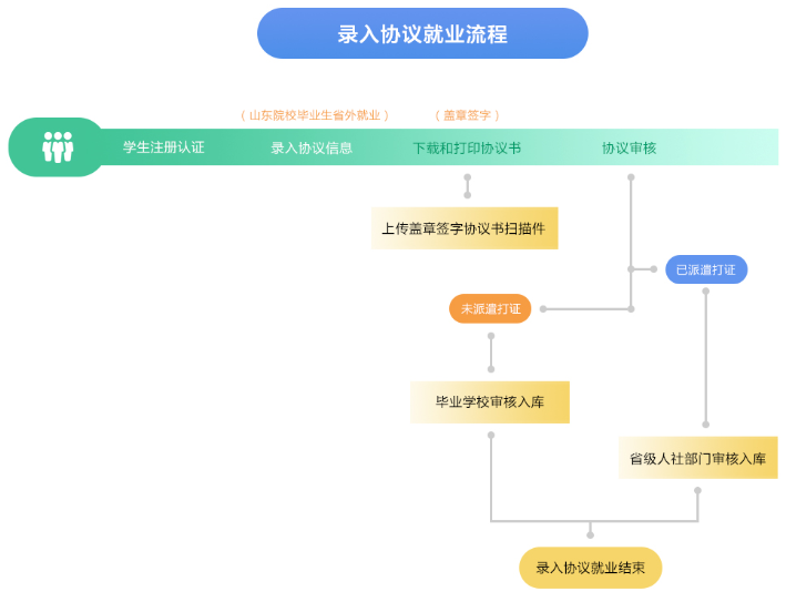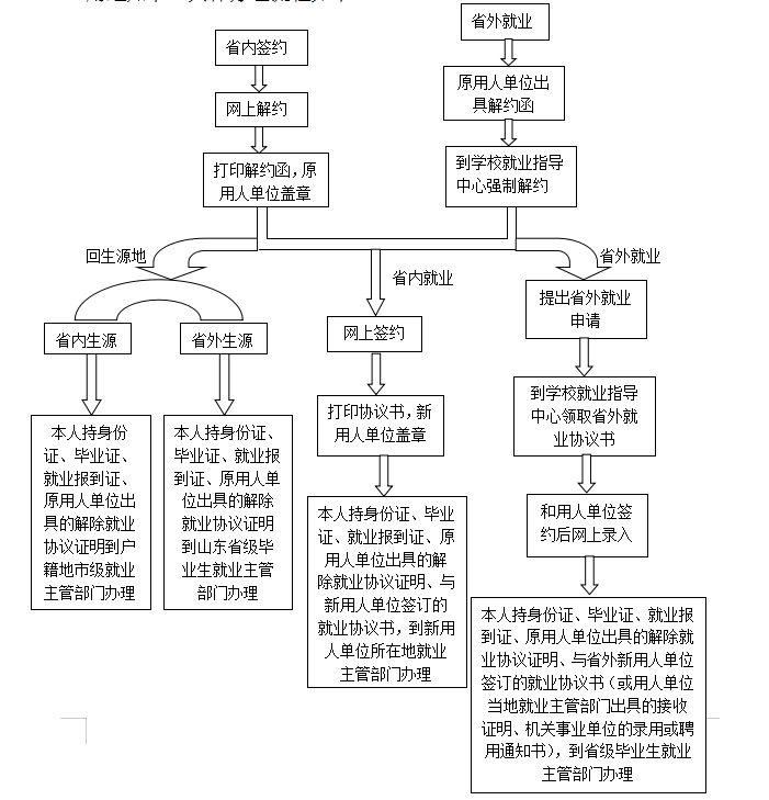 毕业生出省(跨省)就业的,在相应网站申请省外就业,然后带证件到学校领取就业协议书,与接收单位签约,并在相应“就业信息网”上录入签约信息后,持身份证、毕业证、就业报到证、就业协议书到山东省人社厅(教育厅)办理派遣手续。山东省外生源离校时就业报到证签发回户籍地的毕业生,在本省落实就业单位的,到本省用人单位所在地毕业生就业主管部门办理调整手续。