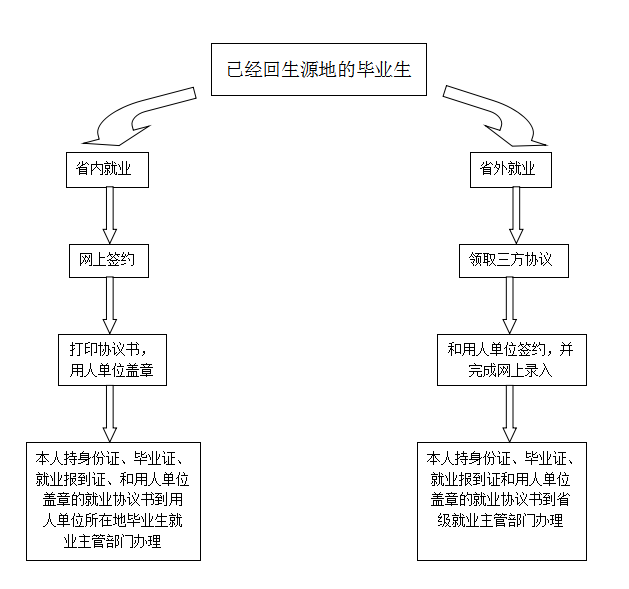 (1)毕业生:与省外与工作单位达成就业意向后,由毕业生登录信息网先提出省外就业申请,并持有效证件到学校就业指导中心领取纸质协议书同用人单位签约;