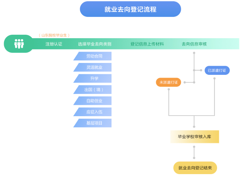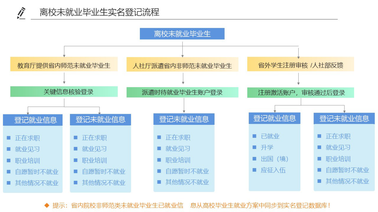 2.就业情况实名登记。离校未就业毕业生协议就业、劳动合同就业、升学、出国、入伍等其他去向功能操作和业务流程与离校前一致。