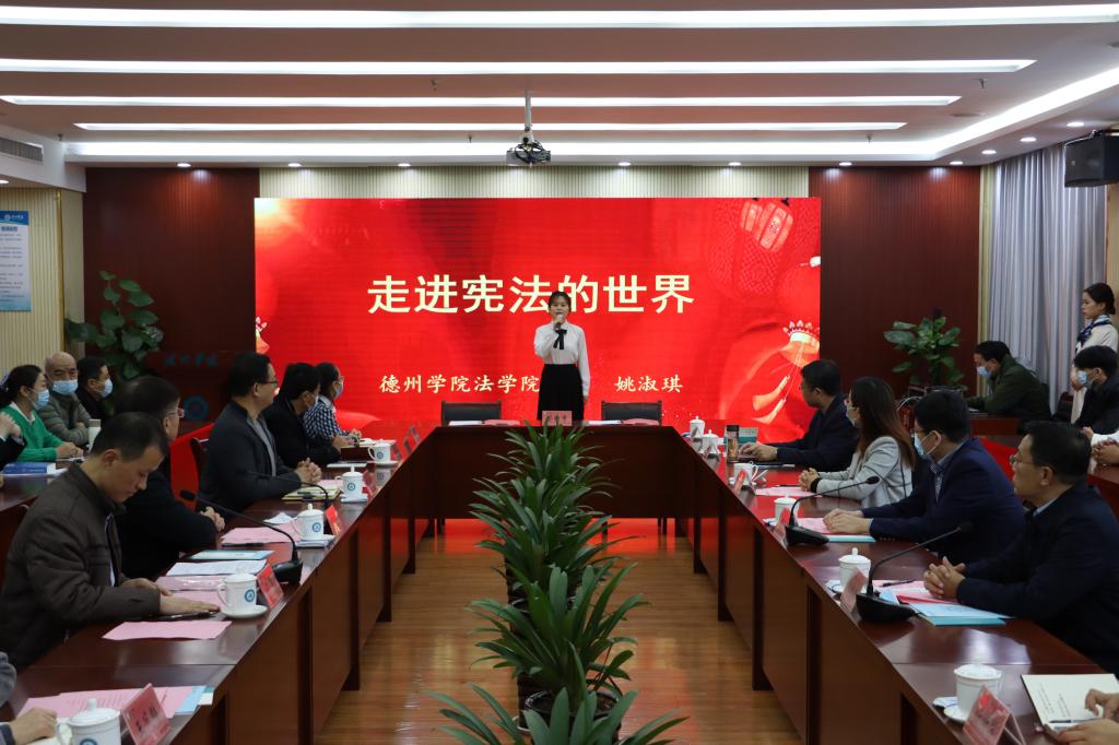 2021年山东省大学生“学宪法 讲宪法”比赛二等奖获奖选手、437ccm必赢国际app2020级法学本科班姚淑琪同学现场演讲了她的比赛获奖作品“走进宪法的世界”。