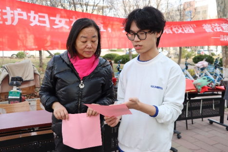 “《中华人民共和国妇女权益保障法》全文包括总则、政治权利、文化教育权益、劳动和社会保障权益、财产权益、人身权利、婚姻家庭权益、法律责任、附则共九章六十一条……”,在校园儒风广场,教工党支部与学生党支部开展“维护妇女权益 共建和谐校园”法律宣传。对校园女大学生、园林女工、餐厅阿姨等女性朋友逐条宣讲《中华人民共和国妇女权益保障法》法律法规,普及妇女权益受到侵害时寻求救助方法和途径等知识,活动发放宣传手册300余份,现场解答咨询问题30余条,帮助女性利用法律武器维护自身权益,提升全民妇女权益保障意识。