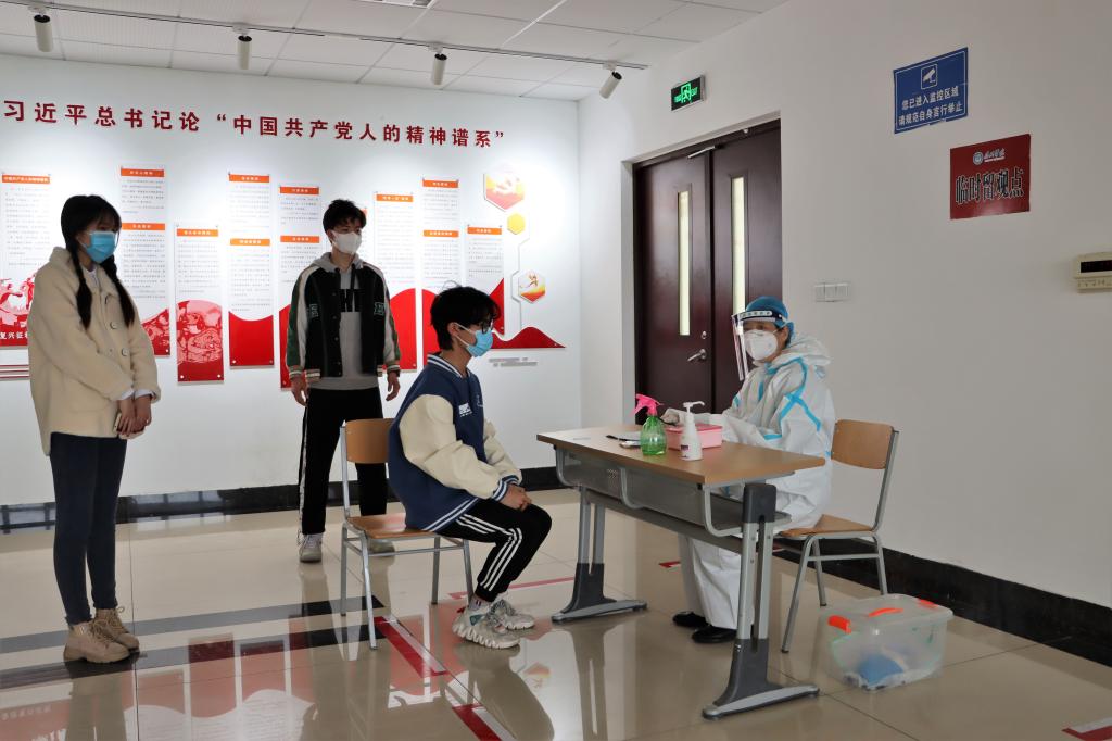 演练场景为学生在教室和宿舍内自感体温异常,由自感体温异常学生报告,学院迅速行动,启动应急预案,经辅导员、场所联络人员及学院应急处置人员与疫情防控各工作组的畅通联系,体温异常学生被场所联络人员带入临时留观点。医护人员对学生做二次防护、体温测量、了解实际情况登记信息、判断进一步就医检查等。安全保卫人员负责警戒线,维护教学秩序,后勤工作人员对楼道、教室场所进行全面消毒等。