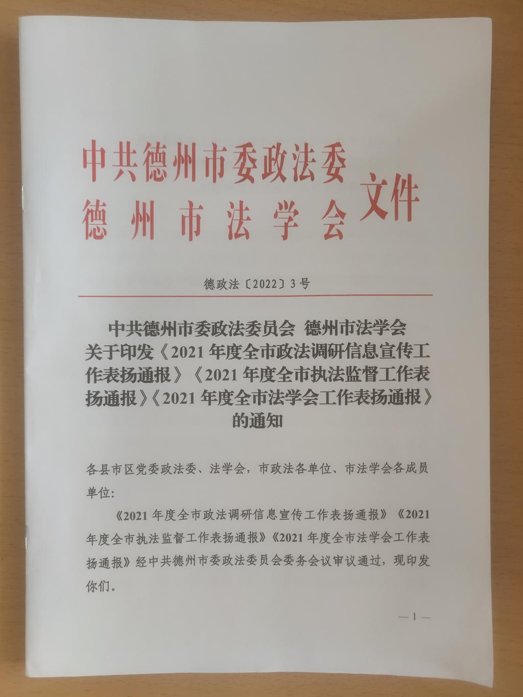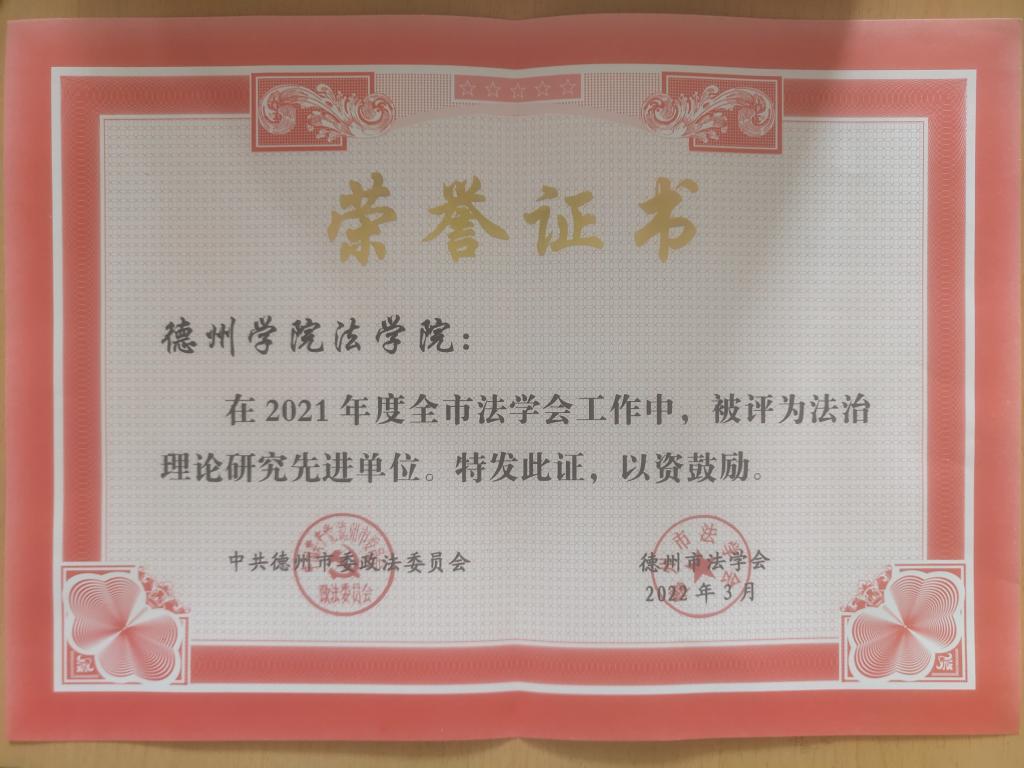 2022年3月2日,中共德州市委政法委、德州市法学会发布了《2021年度全市法学会工作表扬通报》,437ccm必赢国际app被评为“2021年度全市法治理论研究先进单位”,徐丽红副教授被评为“2021年度市法学会会员单位先进个人”。