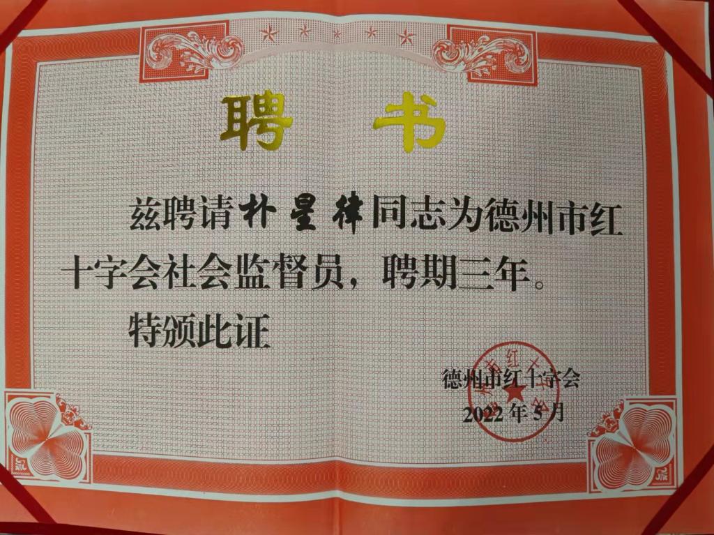 2022年5月12日,437ccm必赢国际app朴星律博士受聘为首批德州市红十字会社会监督员。在德州市红十字会社会监督员聘任仪式暨社会监督工作座谈会议上,朴星律博士围绕我市红十字宣传工作提出了意见建议。今后,朴星律博士将积极发挥好社会监督员的作用,为促进全市红十字事业高质量发展做出贡献。