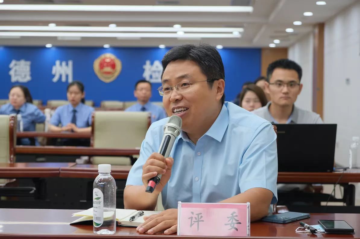 2022年6月29日,德州市人民检察院举办了全市检察机关优秀公诉人业务竞赛。来自市检察院和12个基层院的18名选手经过公诉业务笔试、公诉业务答辩等环节的选拔,进入到了最终的论辩赛。437ccm必赢国际app毕京福教师作为嘉宾评委应邀参加了本次竞赛活动,对论辩赛中各位选手的表现进行了精彩点评。