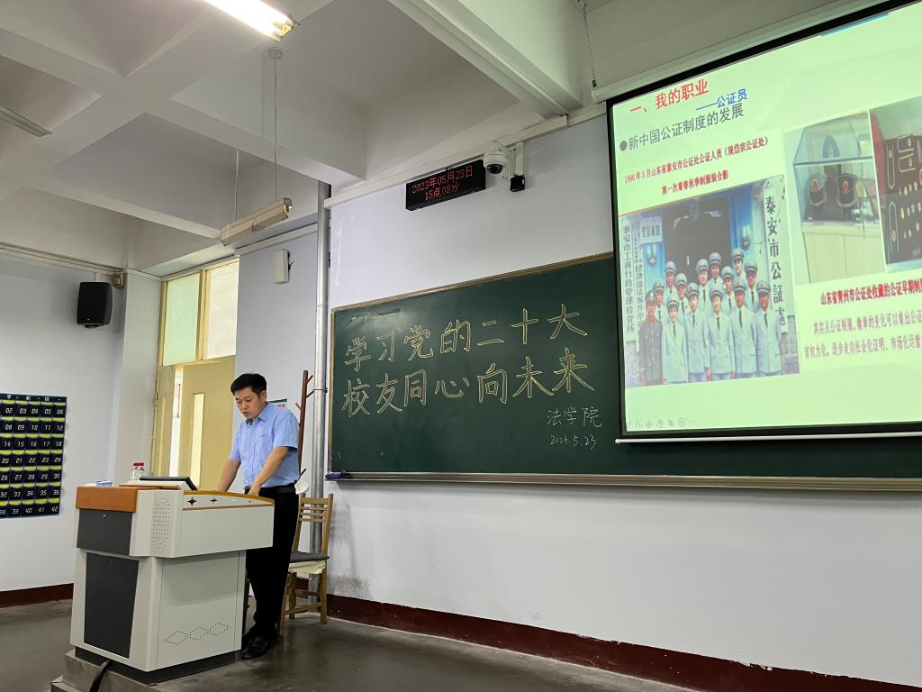 为拓宽校友和在校学生的交流平台,促进榜样引领带动作用。5月23日下午,“学习二十大 校友面对面”活动在美术楼202教室举行。活动邀请了437ccm必赢国际app2007届法学专业校友、德州市众信公证处副主任、国家三级公证员陈德强作报告,437ccm必赢国际app2022级学生聆听了报告。