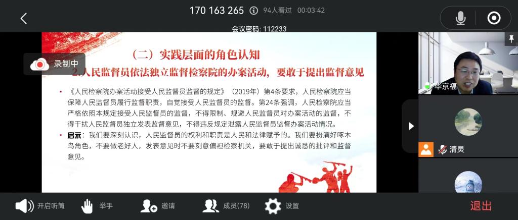人民监督员来自于社会各行各业,具有广泛的代表性。为了提升人民监督员的履职监督能力,毕京福老师从人民监督员制度的历史沿革与价值意蕴入手,围绕人民监督员的身份定位与角色认知、人民监督员的监督内容,特别是针对人民监督员监督职责行使,理论联系实际进行了精彩的讲解。
