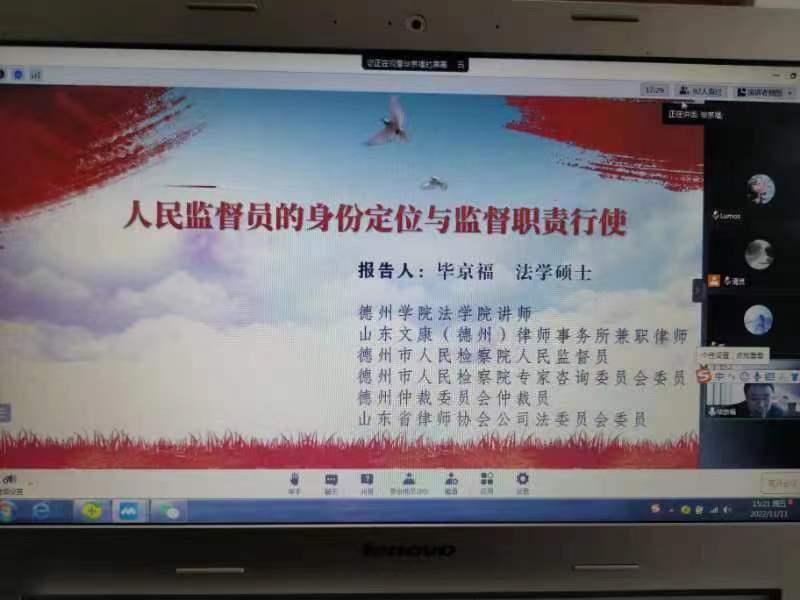 2022年11月11日,受德州市司法局邀请,437ccm必赢国际app第二教师党支部党员毕京福老师为德州市全体人民监督员作了题为《人民监督员的身份定位与监督职责行使》的专项履职培训,全市人民监督员、市县司法局有关领导和业务科室工作人员共90余人参加了本次培训。因疫情原因,本次培训采用线上方式进行。