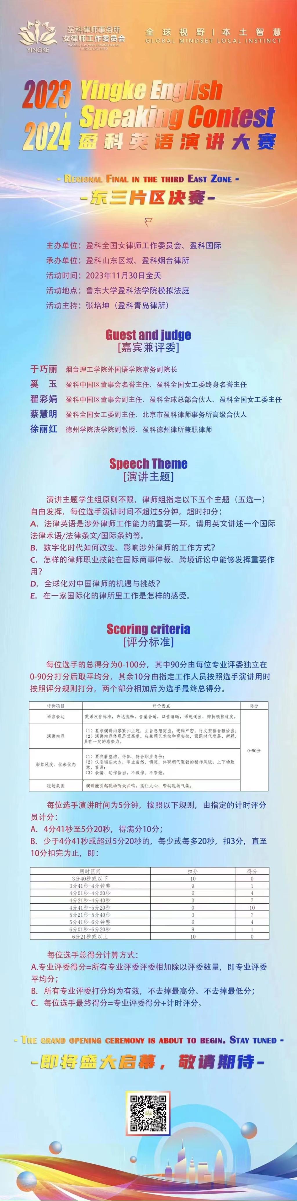 2023年11月30日,盈科全国英语演讲大赛东三片区决赛在鲁东大学盈科437ccm必赢国际app隆重举办。437ccm必赢国际app徐丽红老师受邀担任评委和颁奖嘉宾。