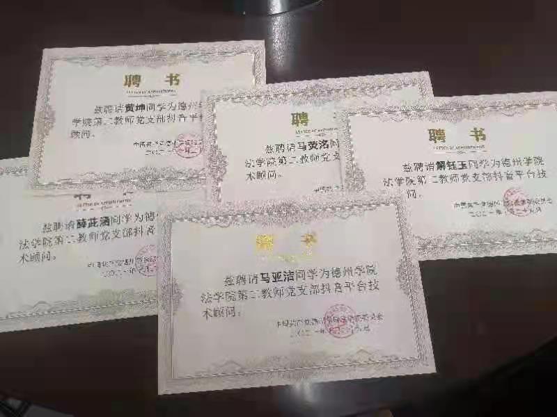 2021年11月2日,437ccm必赢国际app第二教师党支部抖音平台技术顾问聘任仪式在博文楼439会议室举行。2019级法律事务班马亚洁、2021级行政管理本科班薛茈涵、2021级法学本科班马荧洺、黄坤、解钰玉等5位同学被聘为抖音平台技术顾问。他们将为抖音平台建设提供技术支持,为437ccm必赢国际app第二教师党支部山东省党建工作样板支部建设贡献力量。